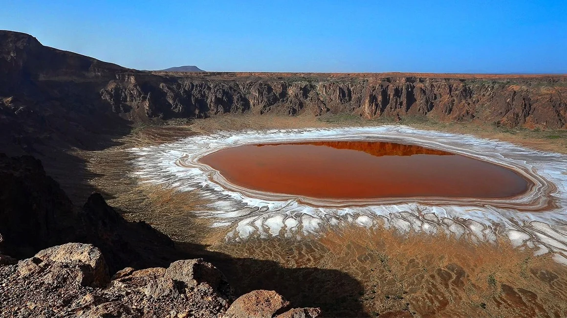 The reward for scrambling back up to the edge of Al Wahbah Crater is being able to watch the setting sun tint the white crater floor. Look for an angle where you can capture the last rays dropping below the crater’s edge.